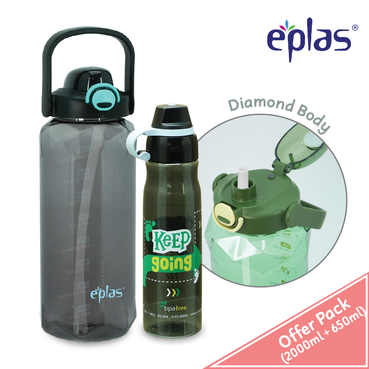 EPLAS OFFER PACK 2in1 2Ltr+650ml Water Bottle Set, Drinking Water Tumbler, Botol Air, BPA Free, EGUD-2000BPA/EGA-650BPA