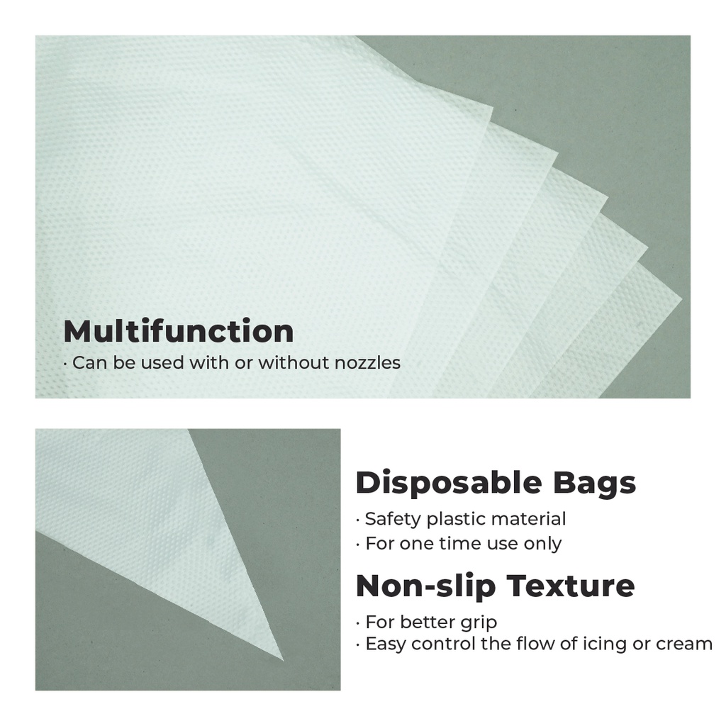 – EXTRA CLEAN, SAFE PLASTIC. These pastry and icing bags are made of clean, food-grade plastic you can use in any kitchen. Cleanup is easy, just toss when finished