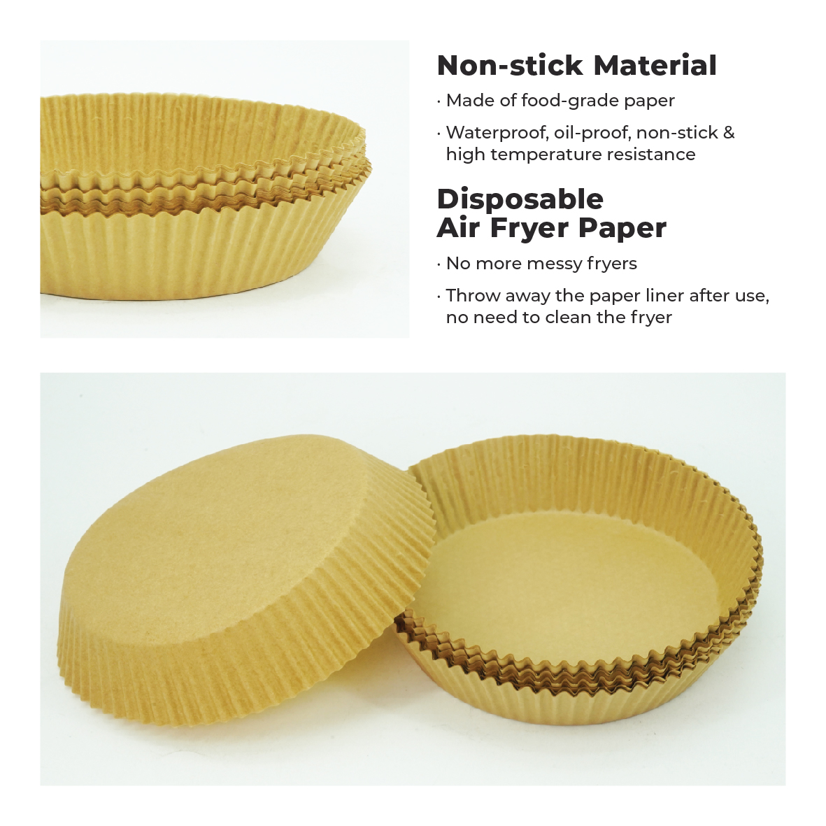 Our air fryer disposable paper liner can effectively keep food residue away from fryer and make it as clean as unused, saving time and effort. These paper liners are must have if you hate cleaning after baking.